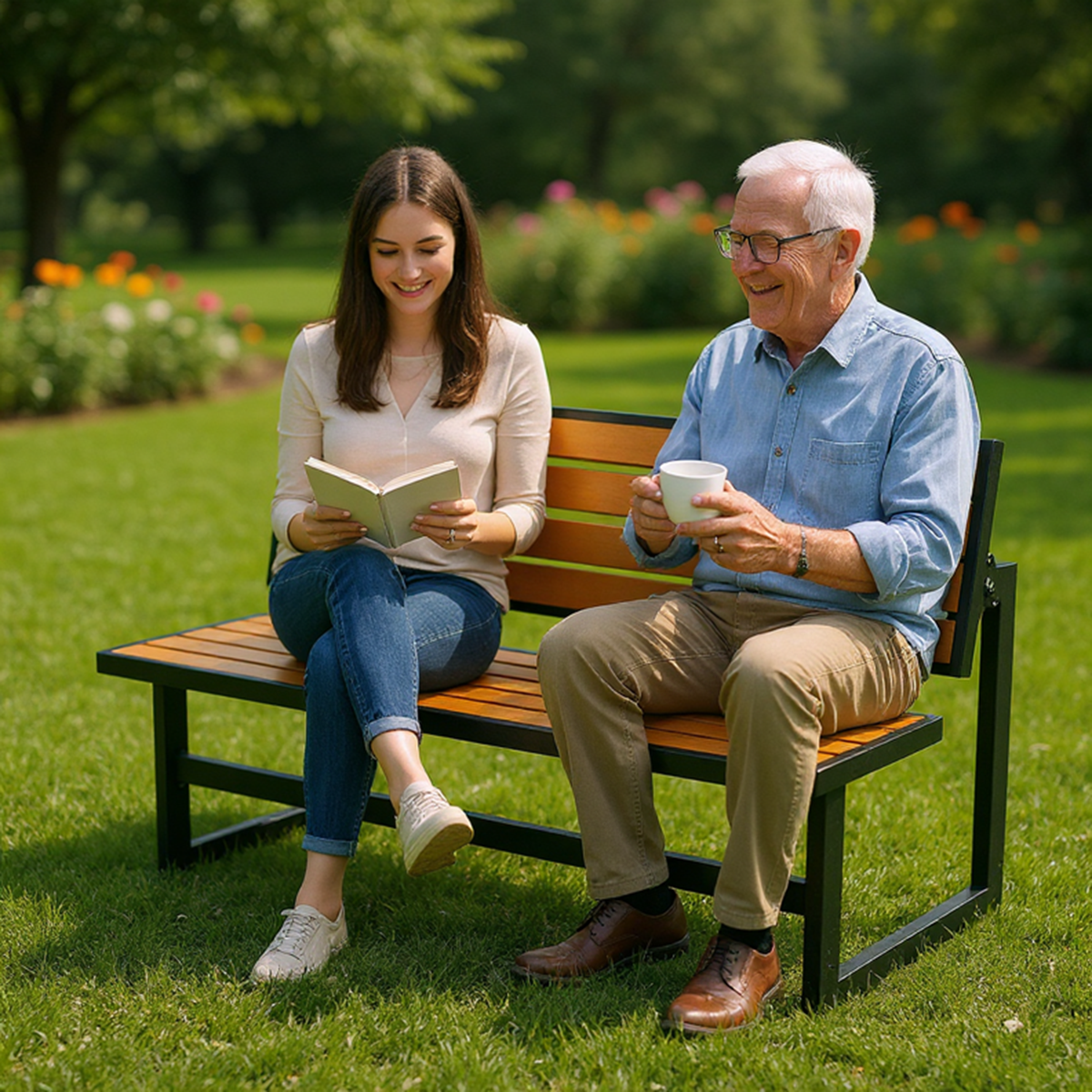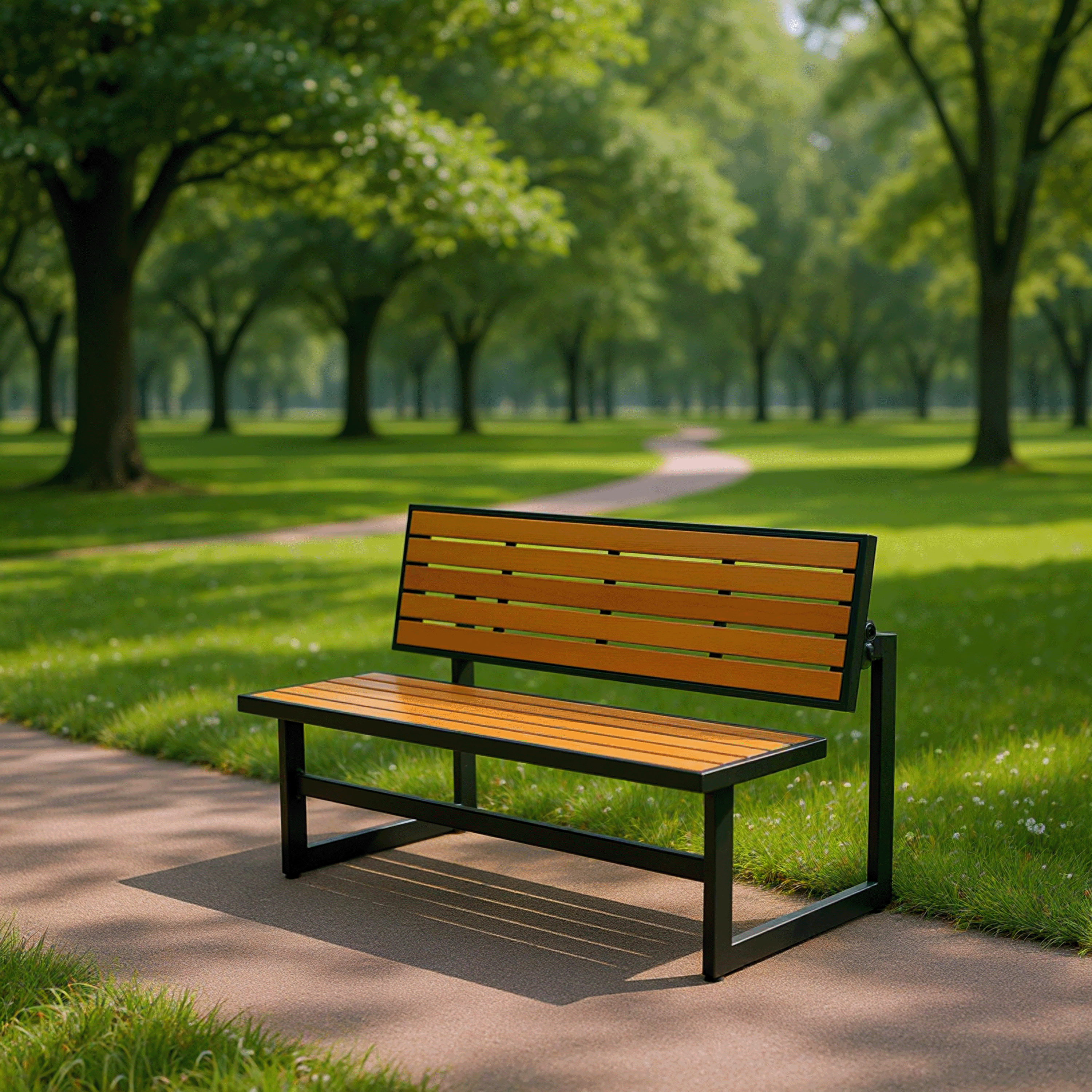 The frame is made from durable steel that is powder coated and features inlaid high impact polystyrene slats that simulates wood but doesn’t require the high maintenance that wood needs to maintain its look and luster.
