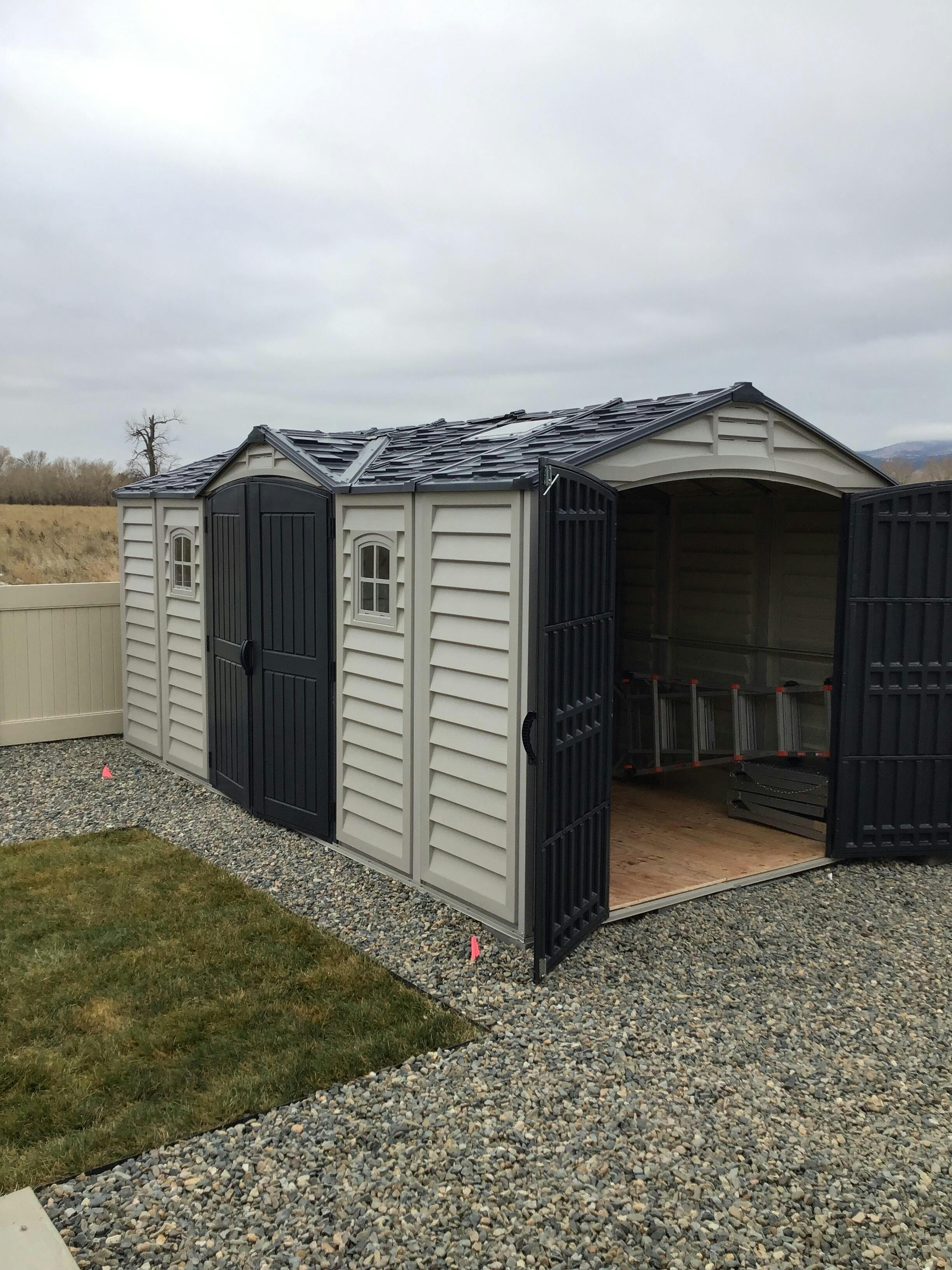 The Apex Pro is the latest line of quality sheds produced under the Duramax brand. US Polymers Inc. Created the name Duramax to signify Durability and Maximum quality and value. The Apex Pro has large double entry and double side doors. This provides storage accessibility from either side of the shed, ensuring maximum utilization of storage and it is easier to acquire the stored equipment. The Apex Pro was attractively designed to add beauty and blend into any yard area. The Apex Pro is maintenance free. It never needs painting and won't rust, rot or dent and is impervious to wood eating insects. This shed has 2 creatively designed skylights on the roof and 2 front windows for light control and has 4 slotted vents for air flow. The Apex Pro has more of the physical characteristics of a house than a shed. The fire-retardant vinyl resin panels are supported by Heavy-Duty interior galvanized steel columns, beams and trusses for strength and roof snow load. Vinyl unlike polyethylene which some manufacturers use is fire retardant and safe to store all your flammable items. The 15-years warranty supports our guarantee of quality and longevity. It has a step by step instruction manual to simplify assembly. We suggest 2-people to facilitate assembly.