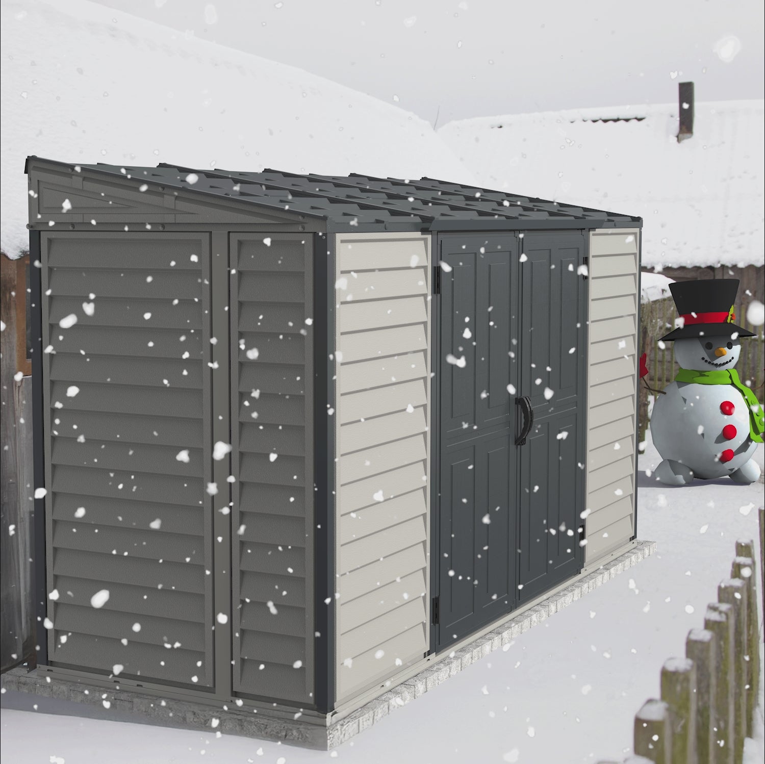 The SideMate PLUS 10x4 vinyl shed is an easy-to-assemble outdoor storage solution designed to be placed on the side of your home. The contemporary design beautifies any backyard while maximizing storage space for yard tools or garden equipment. Constructed of durable all-weather vinyl in an adobe color, the SideMate PLUS vinyl shed is maintenance-free. It will never need painting or treating. It will not rust, dent, rot, mildew or fade. It is also fire retardant and much quieter in the rain than metal storage sheds. The wall columns are reinforced with a solid metal structure, giving the vinyl shed a lot of strength and making it easy to hang shelves or garden tools inside. The foundation kit provides a galvanized metal foundation. It eases the installation process, ensures a square shed and elevates your floor off the ground. With the foundation kit you'll be able to build your shed the day you receive it.
